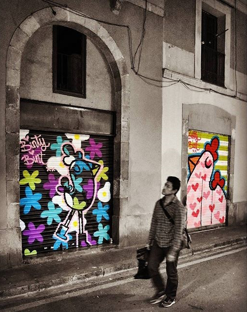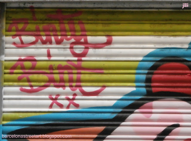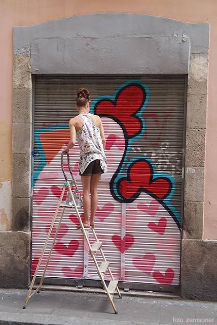 | En 2014 estuvo en Barcelona apoyando " Salvem el Jardí" de Gracia del que os coloco el vídeo gravado ese día, y ha vuelto en 2015 donde la hemos pillado en la calle Nueva de Dulce pintando un cierre |